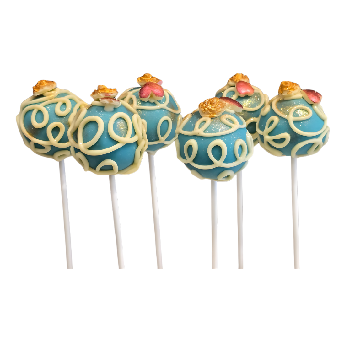Our elegant Blue CakePOPs are hand-dipped in a dreamy blue Callebaut chocolate coating, finished with delicate white chocolate swirls and a tiny handcrafted rose on top. Perfect for birthdays, baby showers, bridal events or any dessert table that needs a little sparkle.