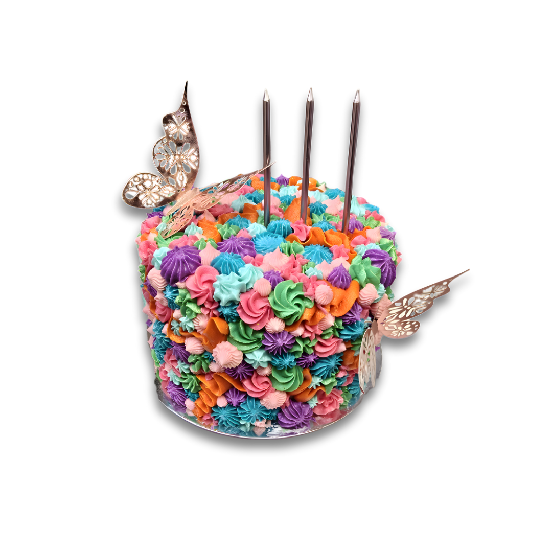 Our Enchanted Fluttercake is covered in hundreds of pastel buttercream rosettes and swirls, with delicate metallic butterflies ready to “take flight” and tall candles for the perfect wish-making moment.