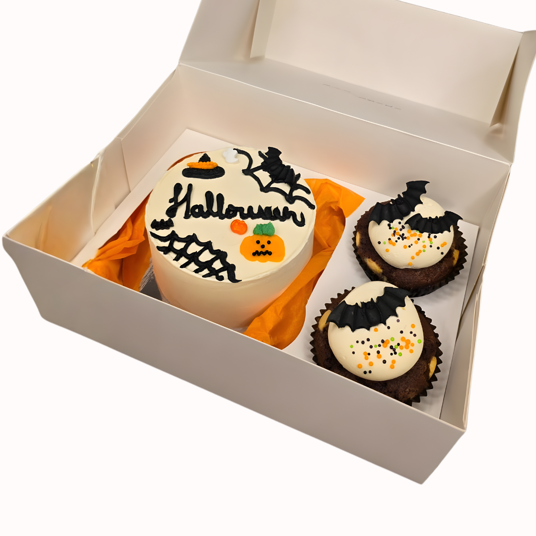 Surprise someone boo-tiful this spooky season with our limited-edition Halloween Gift Box, featuring a hand-decorated mini cake and two hauntingly cute cupcakes. Topped with edible bats, pumpkins, spiderwebs, and Halloween sprinkles, this box is the perfect mix of spooky and sweet — ready to gift or devour!