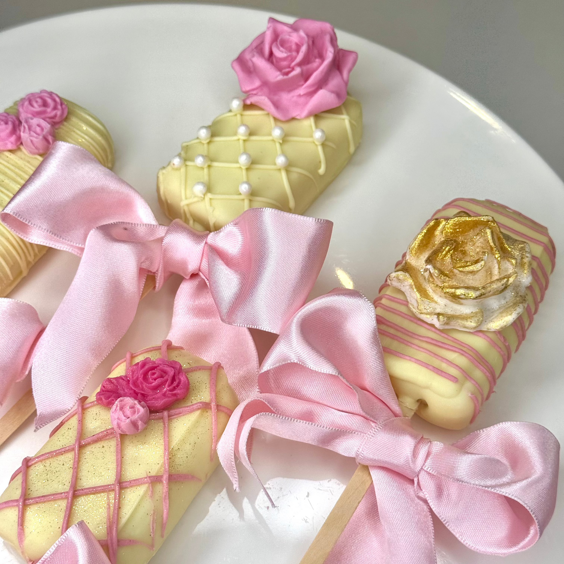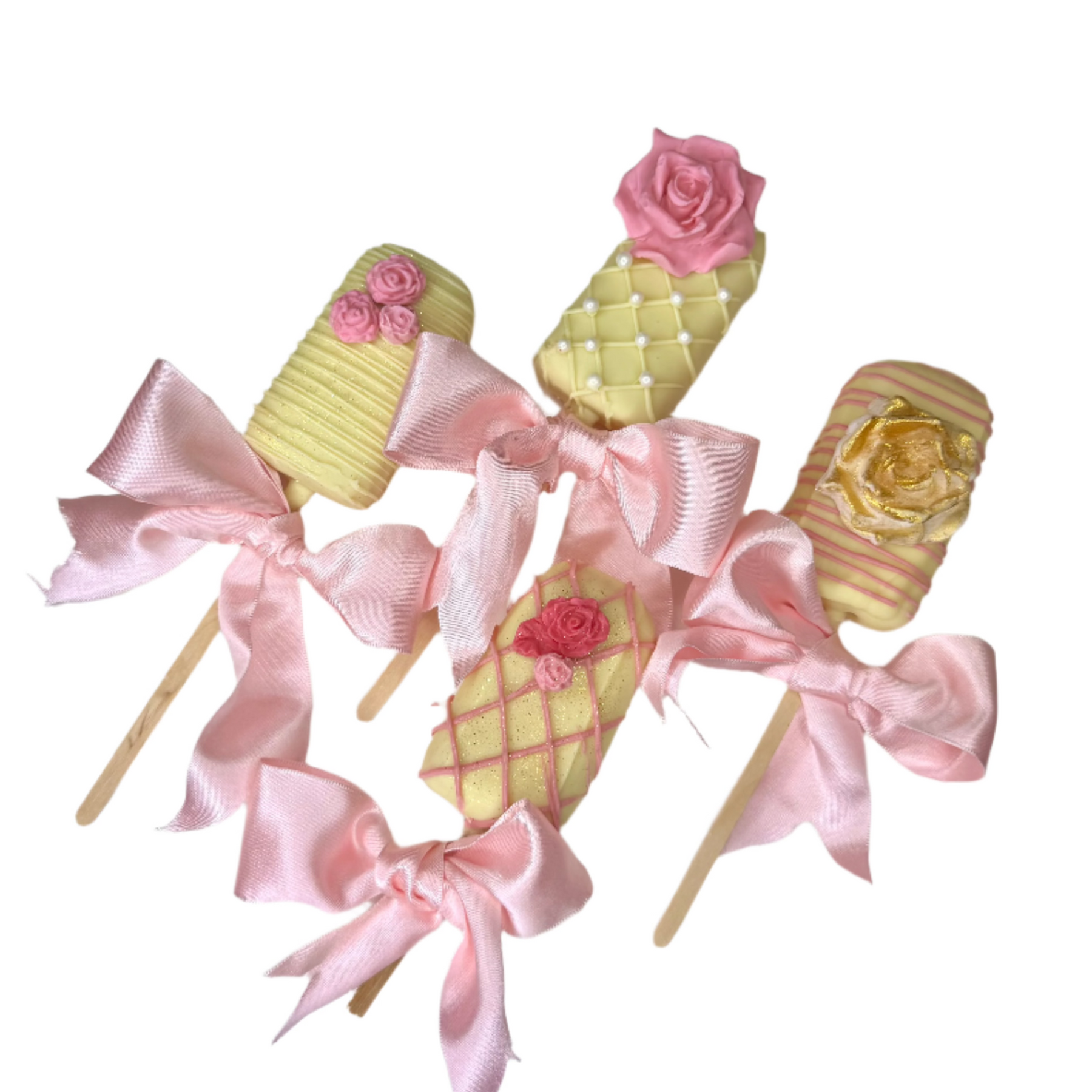 These long, elegant Cakepops are coated in silky white chocolate and beautifully adorned with delicate pink roses and golden accents.