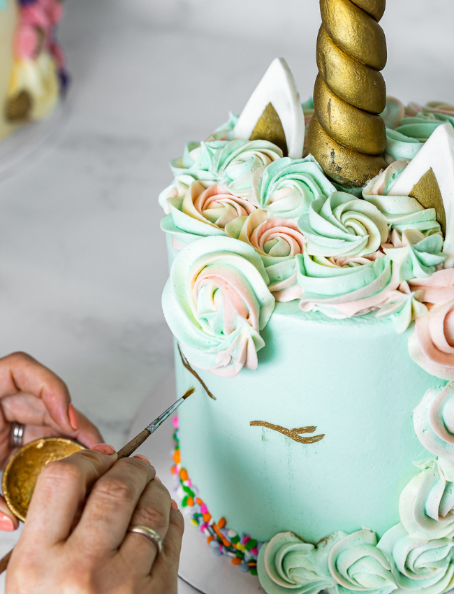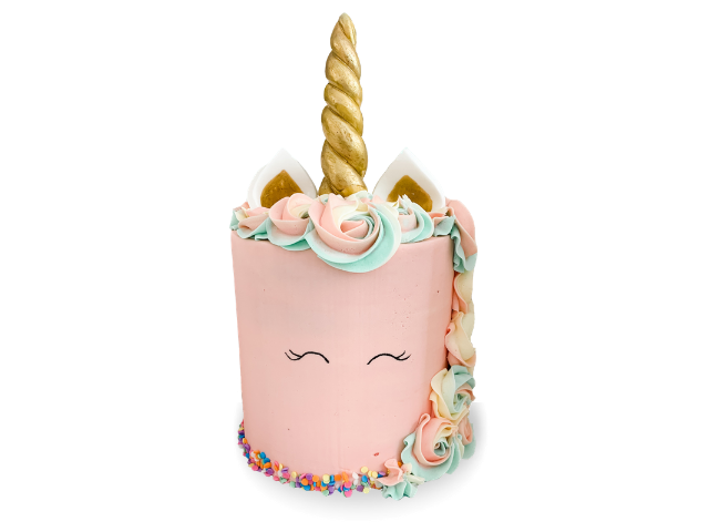 Double height cake with your choice of coloured buttercream. Each unicorn is magical and individual and we create all the details by hand, including the majestic gold horn, ears and pastel blue, pink and white mane.