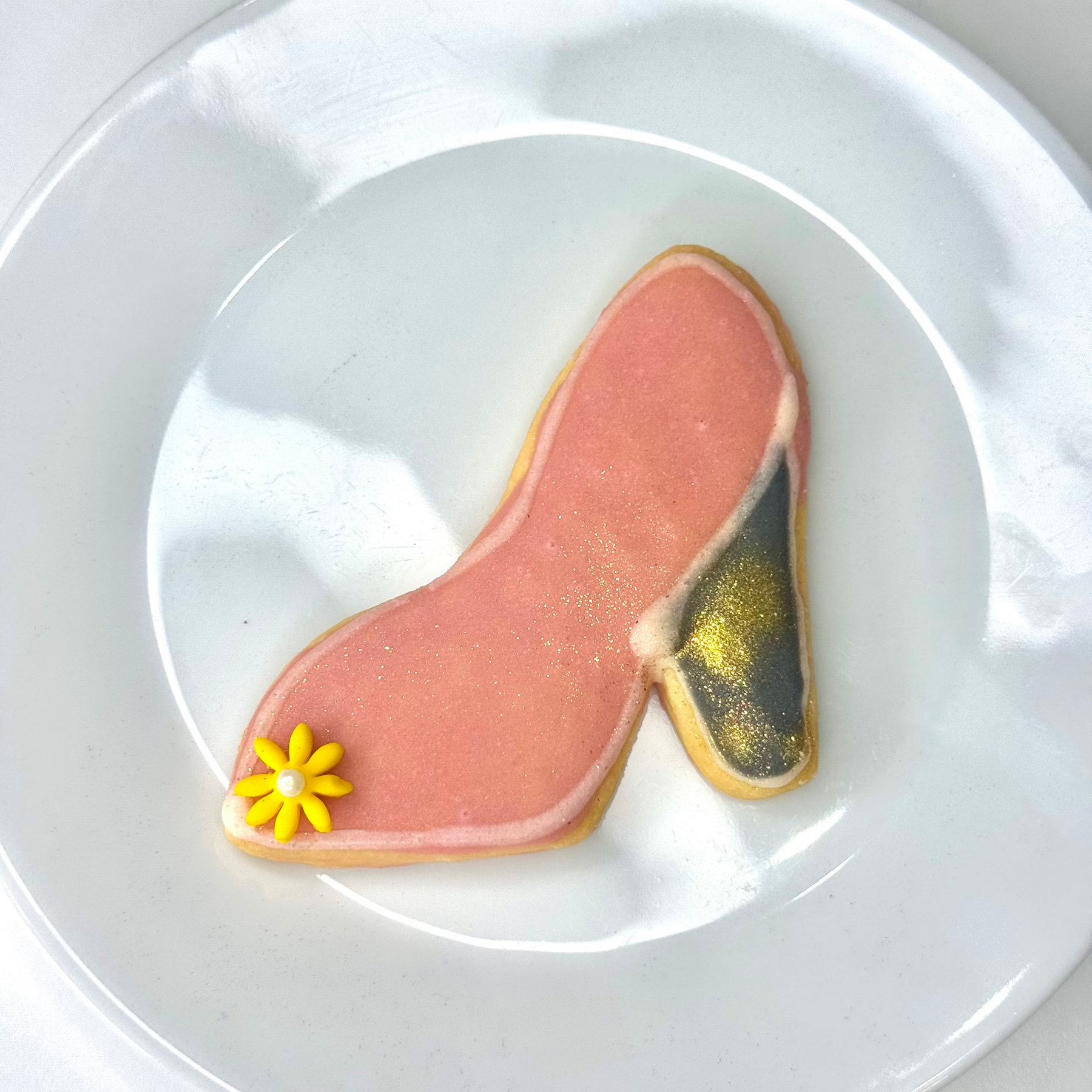 Step into sweetness with our charming shoe-shaped cookies, elegantly decorated in soft pink with a delicate yellow flower. These beautifully handcrafted treats are perfect for adding a touch of whimsy to any celebration.