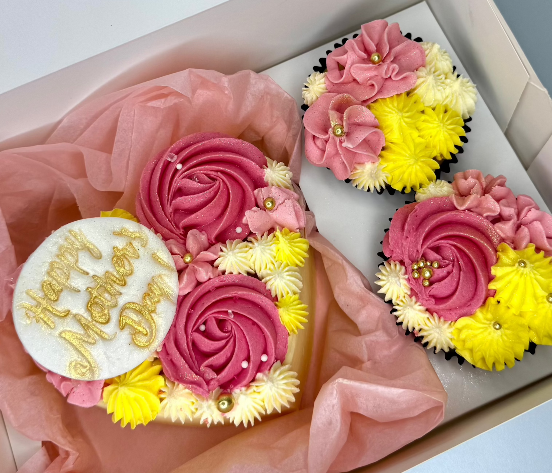 Celebrate the love and care of mom with our Mother’s Day Duo-Box, a perfect gift of sweetness and appreciation! This special box features a delicious heart cake alongside two beautifully decorated cupcakes in soft pastel hues, topped with elegant floral accents and golden pearls.