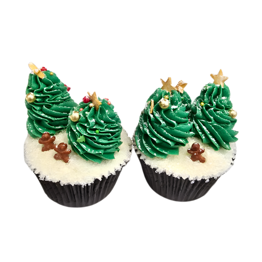 Our Christmas Tree in the Snow cupcake is topped with two hand-piped buttercream trees, trimmed with golden stars and baubles, all sitting on a blanket of sparkling “snow” with a tiny gingerbread man in the middle.