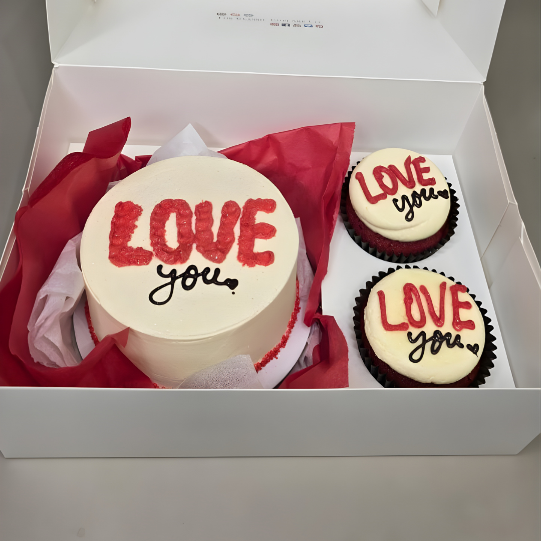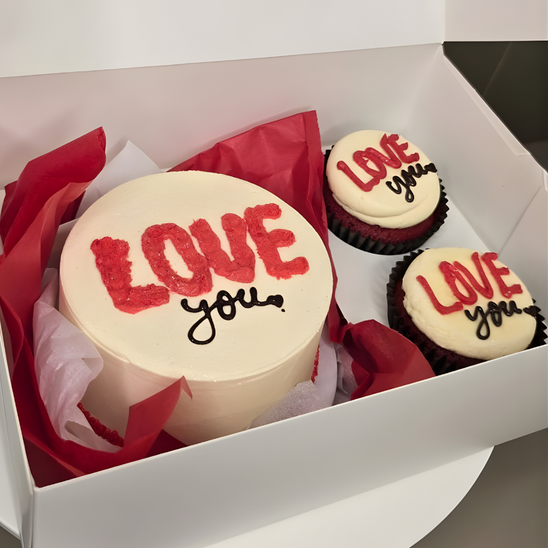 Say “I love you” the sweetest way possible. Our Love You Duo-Box features a handcrafted mini cake with LOVE you piped on top, paired with two matching cupcakes, all tucked into a luxe gift box lined with romantic red tissue.
