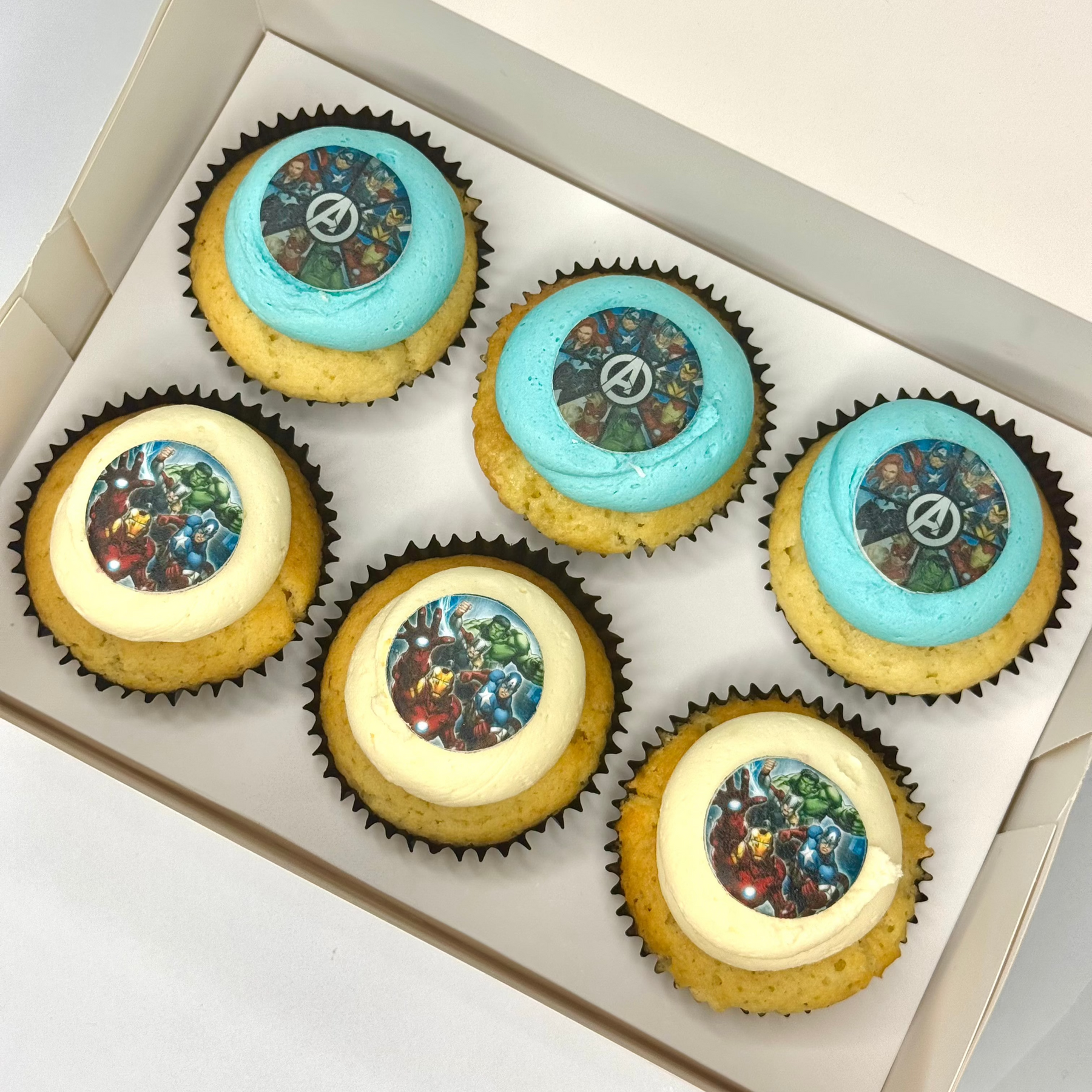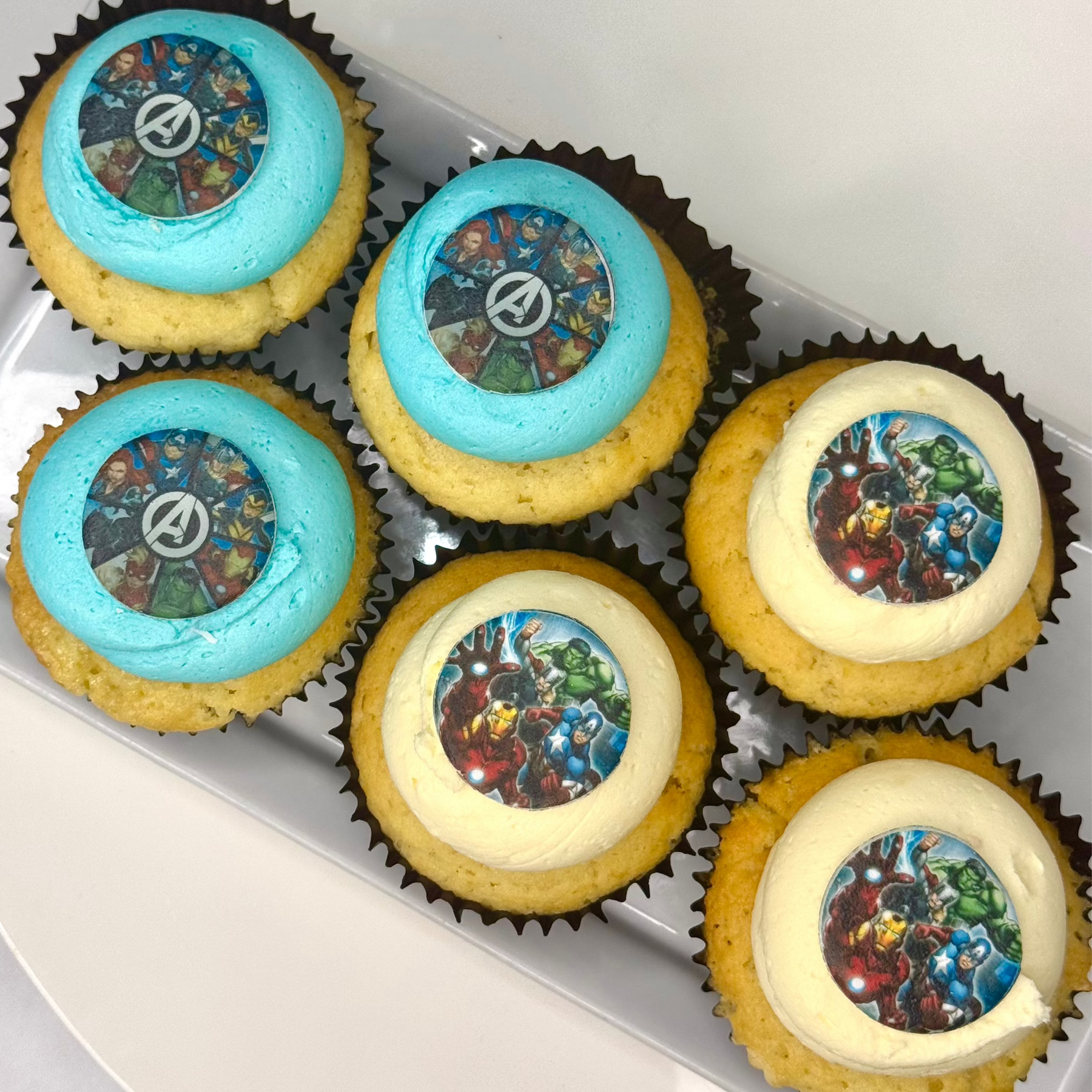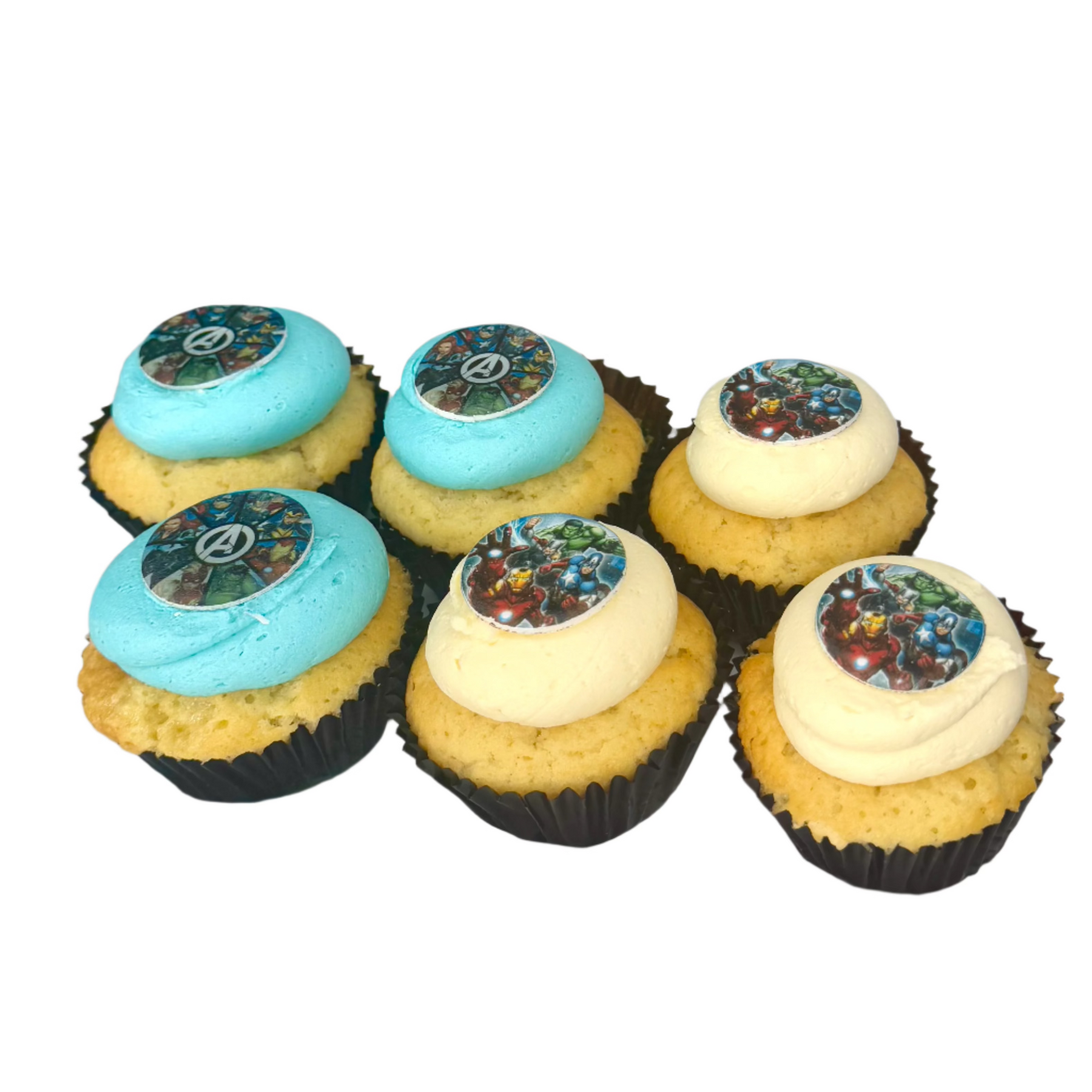Suit up for action with our Avengers Cupcakes! These super-powered treats feature a moist base of your choice, topped with dynamic swirls of blue and white vanilla ganache, and finished with a signature Avengers token for that epic final touch.