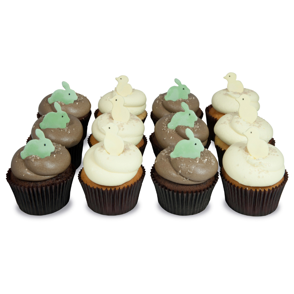 A beautiful collection of Vanilla & Chocolat cupcakes with fondant bunny & chick. Ideal for Easter or Baby Showers.