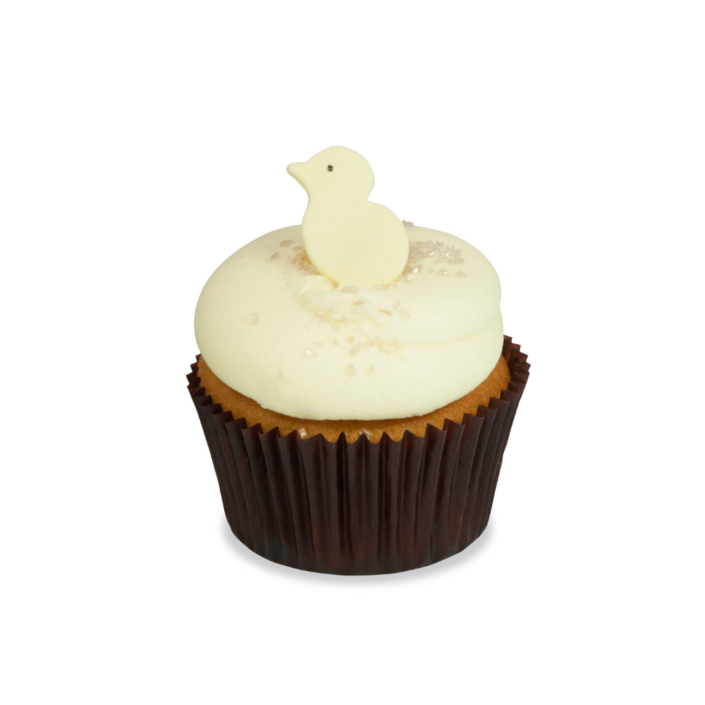 Vanilla: A light Madagascar vanilla sponge topped with whipped buttercream frosting and pastel yellow chick token.