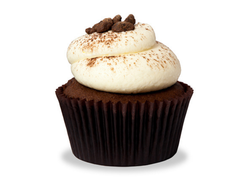 Belgian Callebaut chocolate cupcake topped with whipped white buttercream and chunks of Belgian chocolate with 100% cacao powder.