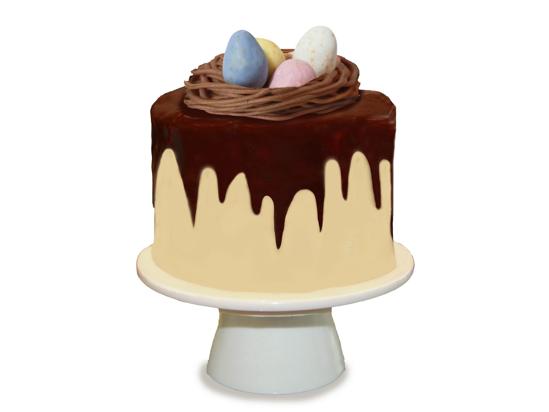A beautiful all natural Callebaut chocolate mud cake filled with salted caramel buttercream, decorated with drippings of rich dark Callebaut chocolate ganache and a beuatifully piped ganache nest filled with De Bock Belgian praline eggs.