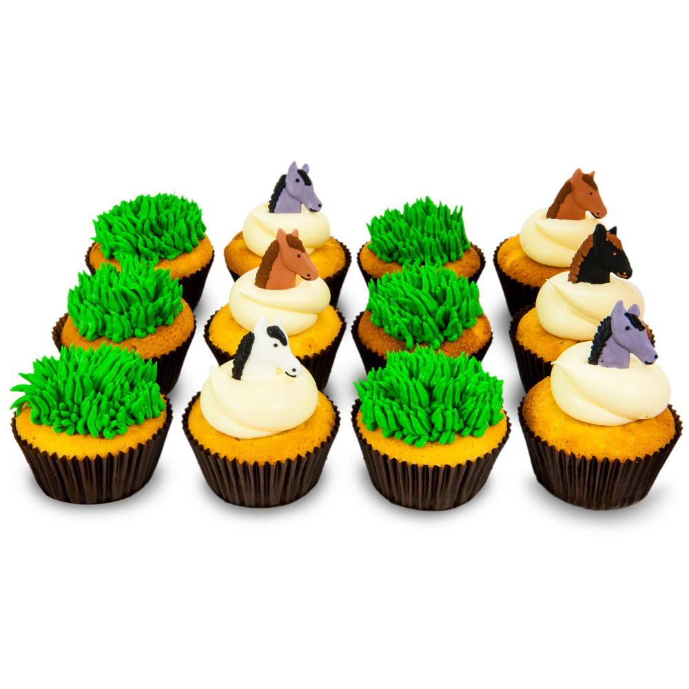 Delicious all-natural cupcakes baked fresh just for you and topped with green buttercream grass and sugar fondant horses.
