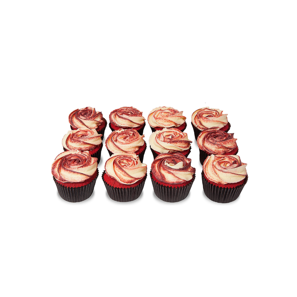 These sensational mini red velvet rose cupcakes are the perfect gift! These buttercream roses are made with the finest ingredients including Organic vanilla, free range eggs and all-natural colours. (Red colour may vary from cupcake to cupcake).