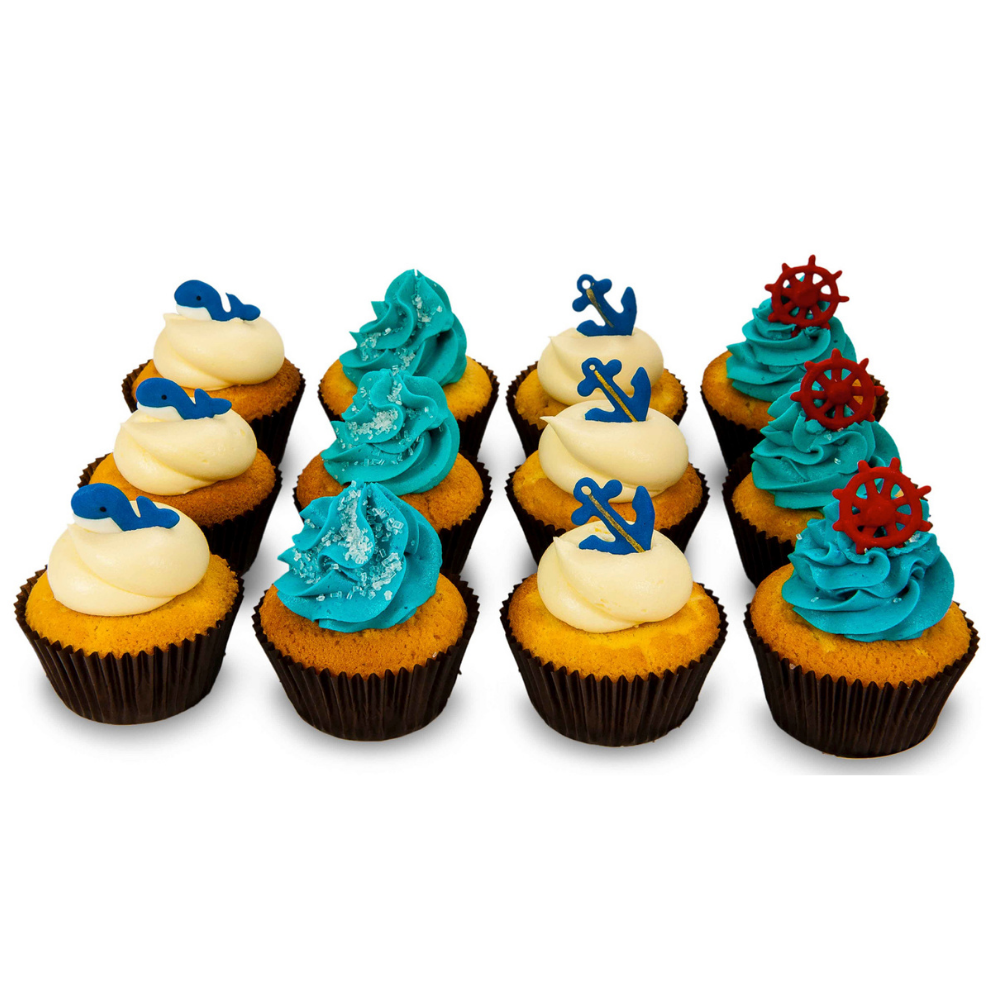 12 perfect cupcakes with vanilla buttercream topped with 3 whale cupcakes, 3 blue ocean wave cupcakes, 3 anchor cupcakes and 3 ship wheel cupcakes.