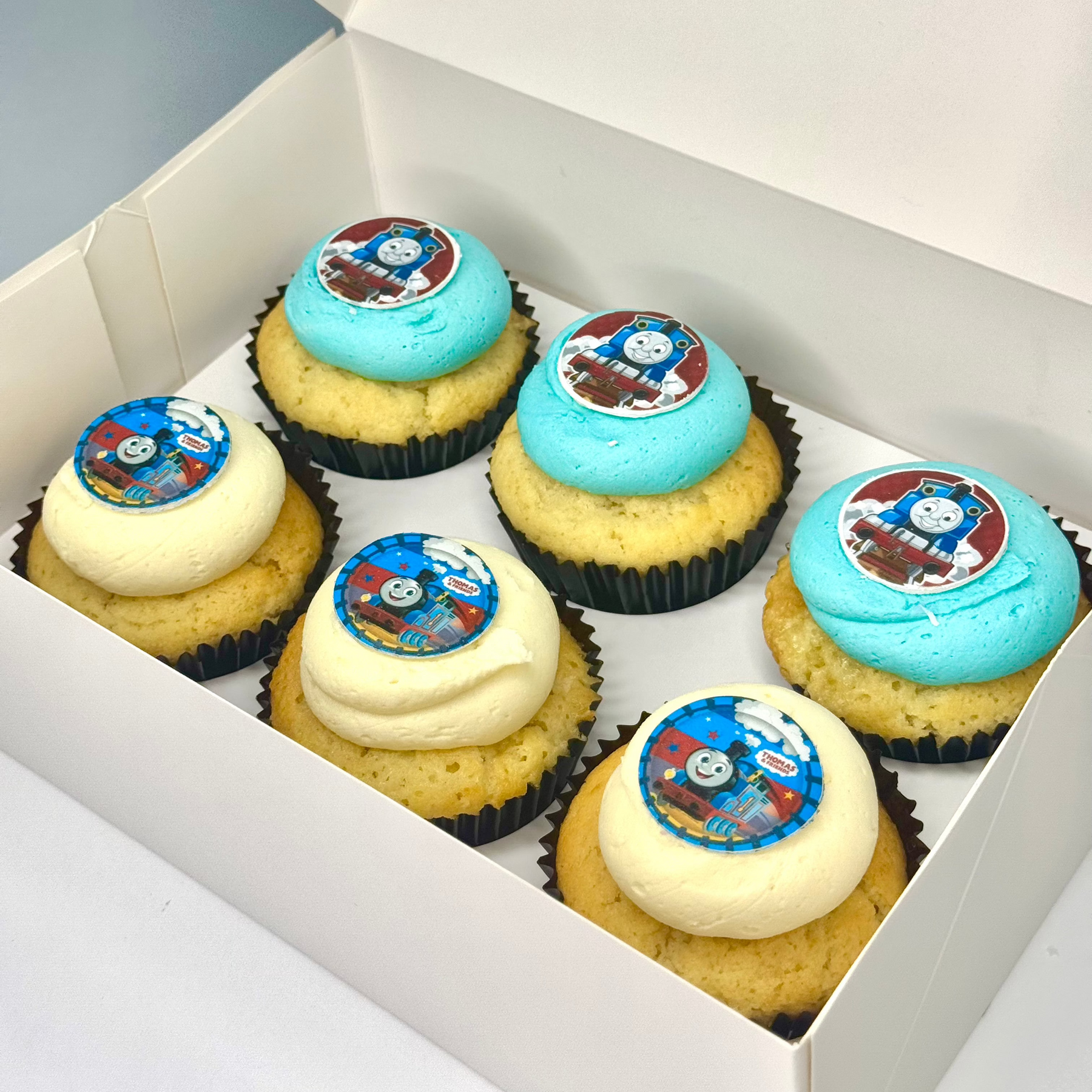 All aboard for a sweet adventure with our Thomas the Train Cupcakes! These delightful treats feature a moist base of your choice, topped with cheerful swirls of blue and white vanilla ganache, and finished with a signature Thomas the Train token for a fun, railway-ready touch.