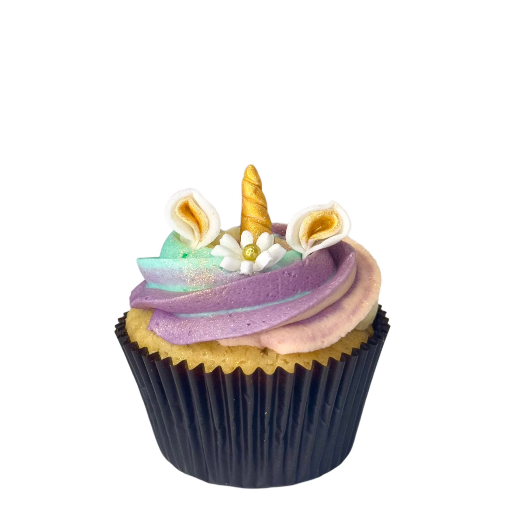 A dreamy delight with a fluffy sponge, topped with a swirl of rainbow buttercream, and finished with edible glitter, sprinkles, and a golden unicorn horn topper.