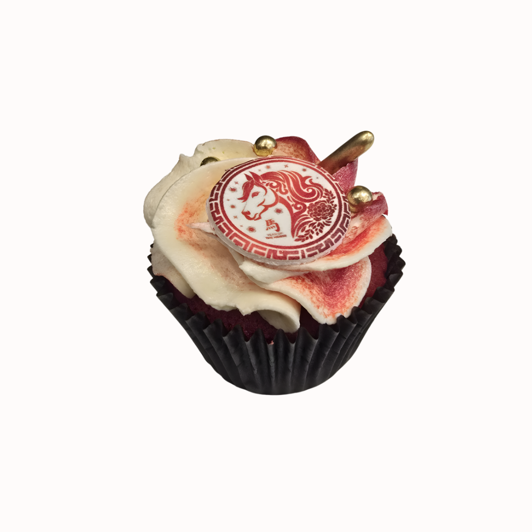 Celebrate Lunar New Year 2026 – Year of the Horse – with a little bite of good luck! Our Chinese New Year Cupcake features a rich red velvet base topped with silky vanilla buttercream, hand-swirled in festive red and ivory tones. Each cupcake is finished with an edible printed topper and golden pearls for that extra touch of prosperity and sparkle.